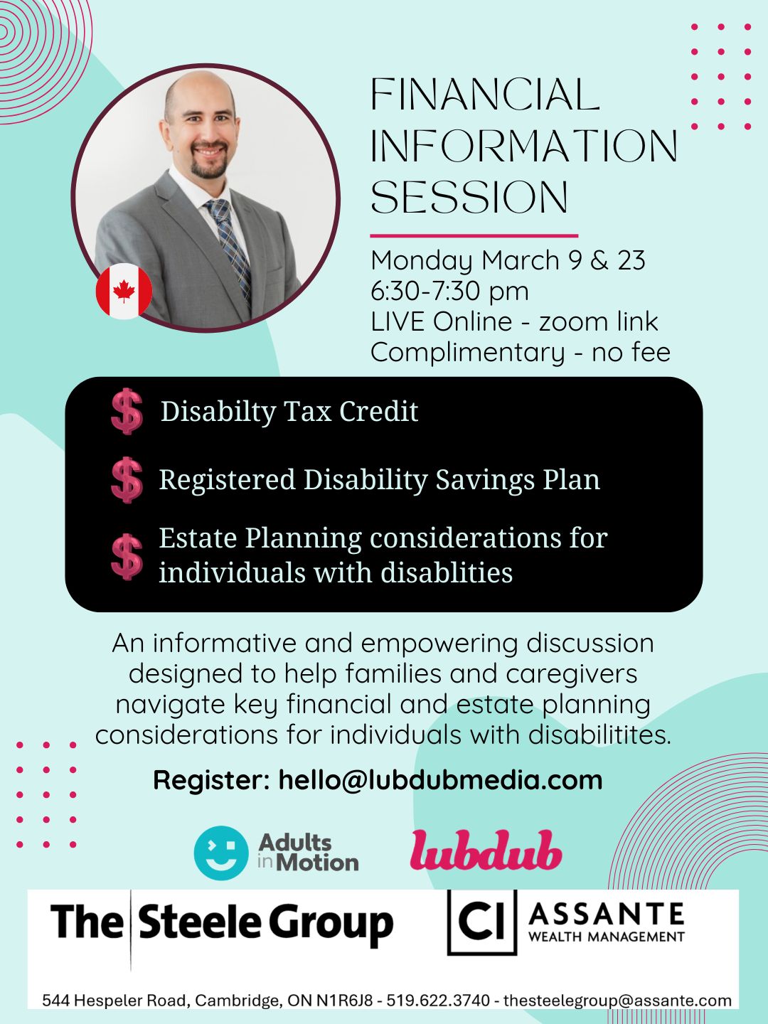 Join us for one of two sessions at 6:30pm EST on Monday, March 9 or Monday, March 23, 2026. These sessions will be informative and empowering discussions designed to help families and caregivers navigate key financial and estate planning considerations for individuals with disabilities in Canada.